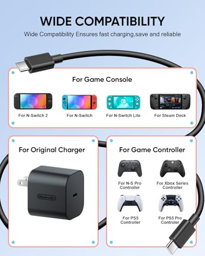 【Twin Charging Freedom】- Package includes 2 premium 5FT/1.5M charging cords for Nintendo Switch 2, allowing simultaneous charging for switch console/ Steam Deck console/ XBOX series/ PS5 controllers or keeping backups in different rooms/car. Ideal for families with multiple gamers or devices. Compatible with most Type-C devices and you can charging in any corner.